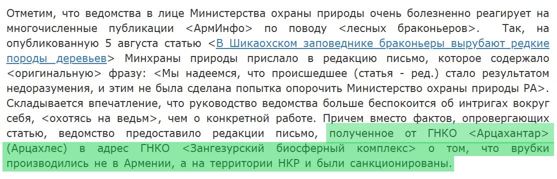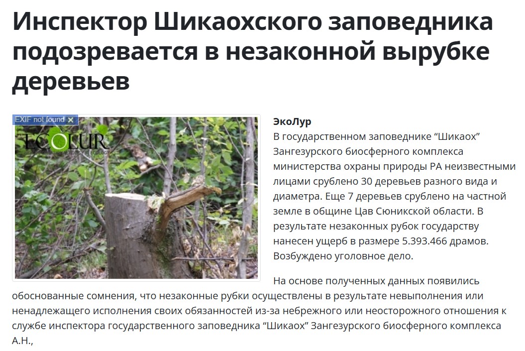 Fakt 4. Ermənistanın tanınmış ekoloji saytı “EkoLur” 6 dekabr 2017-ci ildə “Şıxhovuz qoruğunun müfəttişi ağacların qanunsuz kəsilməsində şübhəli bilinir” başlıqlı xəbər yayıb.