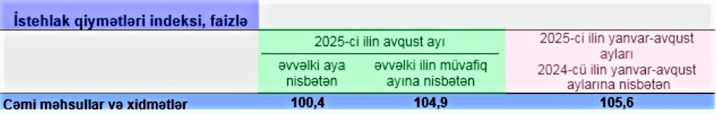 Məlumdur ki, beynəlxalq praktikada, o cümlədən Azərbaycanda inflyasiyanın illik müqayisəsi bir ay üzrə deyil, cari ilin ötən ayları ilə əvəlki ilin eyni dövrü (ayları)  arasında aparılır. Məhz bu müqayisə əsasında qiymət indeksinin hansı faiz-bənd üzrə artımı müəyyənləşir. DSK-nin inflyasiya ilə bağlı məlumatında da qeyd edilir ki, 2025-ci ilin yanvar-avqust aylarında istehlak qiymətləri indeksi əvvəlki ilin müvafiq dövrünə nisbətən 5,6 faiz təşkil edib.