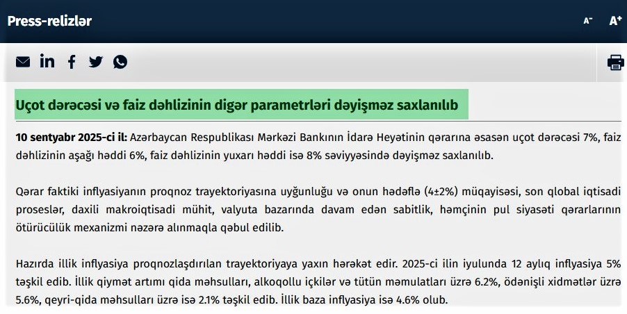 Bu rəqəmlər isə Mərkəzi Bankın (MB) açıqladığı inflyasiya ehtimal göstəriciləri ilə tam üst-üstə düşür. MB-nin sentyabrın 10-da açıqladığı uçot dərəcəsi və inflyasiya ilə bağlı məlumatda bildirilir ki, 2025-ci ilin iyulunda 12 aylıq inflyasiya 5 faiz təşkil edib.
