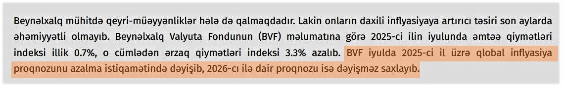 MB-nin məlumat xülasəsində qeyd edilir ki, “inflyasiya ilə bağlı beynəlxalq mühitdə  qeyri-müəyyənliklər hələ də qalmaqdadır. Lakin onların daxili inflyasiyaya artırıcı təsiri son aylarda əhəmiyyətli olmayıb. Beynəlxalq Valyuta Fondunun (BVF) məlumatına görə 2025-ci ilin iyulunda əmtəə qiymətləri indeksi illik 0,7 fazi, o cümlədən ərzaq qiymətləri indeksi 3,3 faiz azalıb. BVF iyulda 2025-ci il üzrə qlobal inflyasiya proqnozunu azalma istiqamətində dəyişib, 2026-cı ilə dair proqnozu isə dəyişməz saxlayıb”.