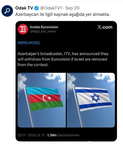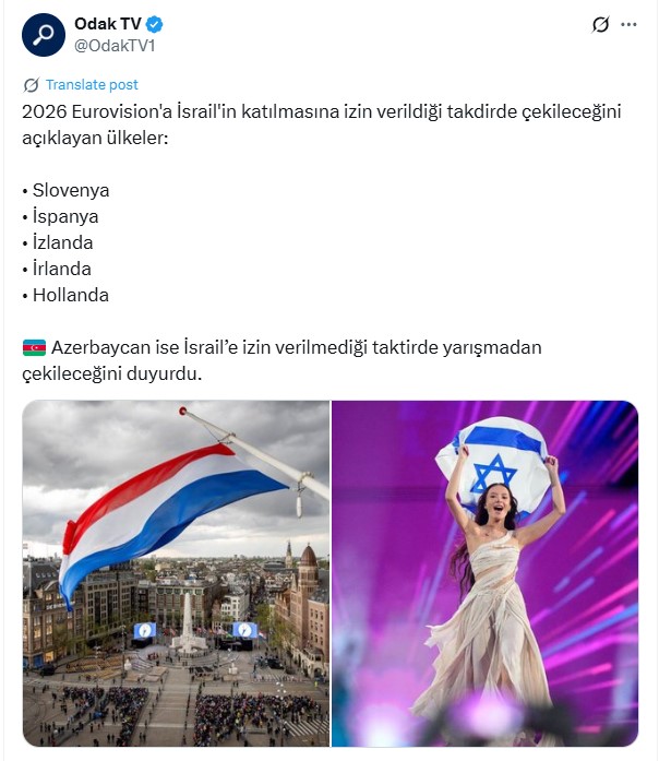 Son günlərdə “odaktv1” adlı “X” hesabı Azərbaycanla bağlı "İsrailin iştirakına icazə verildiyi təqdirdə, aşağıdakı ölkələr 2026-cı ildə Avroviziya mahnı müsabiqəsində iştirakdan imtina edəcəklər: Sloveniya, İspaniya, İslandiya, İrlandiya, Hollandiya” tvit atıb və davamında “İsrailin iştirakına icazə verilmədiyi təqdirdə Azərbaycan müsabiqədən imtina edəcəyini bildirib"-cümləsi ilə Türkiyə və Azərbaycan mediası, habelə sosial media seqmentində böyük müzakirələrə yol açıb.