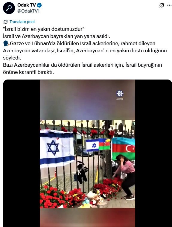 10. Əvvəlcə azərbaycanlıların Bakıda İsrail bayrağı önünə qərənfillər düzdüklərini yazan bu hesab, daha sonra Azərbaycan məktəblərinin birində oktyabrın 7-dən bəri qətlə yetirilən yəhudilərin xatirəsi üçün anım mərasimi keçirildiyini bildirib.
