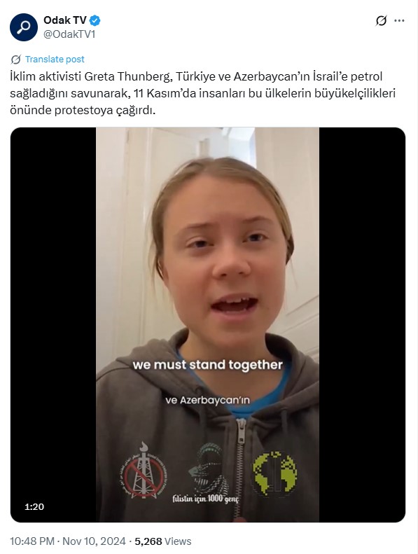 9. “İqlim fəalı” adlandırılan Qreta Tunberqin COP–29 öncəsində insanları Türkiyə və Azərbaycan səfirlikləri qarşısında etiraz aksiyası keçirməyə çağırışını paylaşmaqdan çəkinməyib.