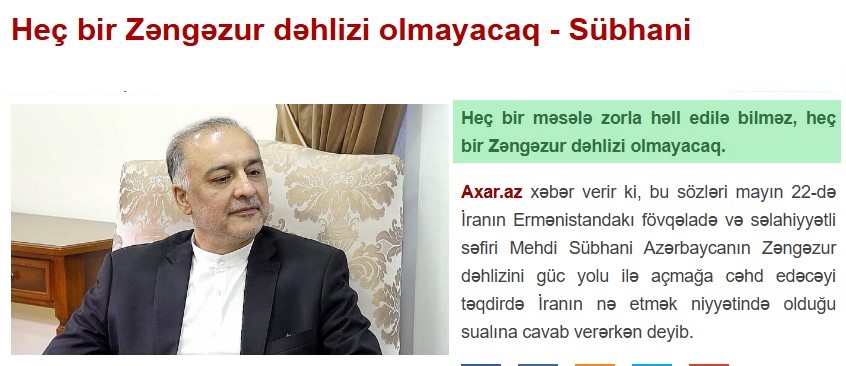 Belə olan halda Sobhaninin Ermənistan vətəndaşlarının Naxçıvan vasitəsilə İrana getməli olmasını dilə gətirməsi tamamilə fərqli məna daşıyır və bir daha təkrar edirik ki, İran Ermənistanı coğrafi olaraq özünə bağlı sayır.