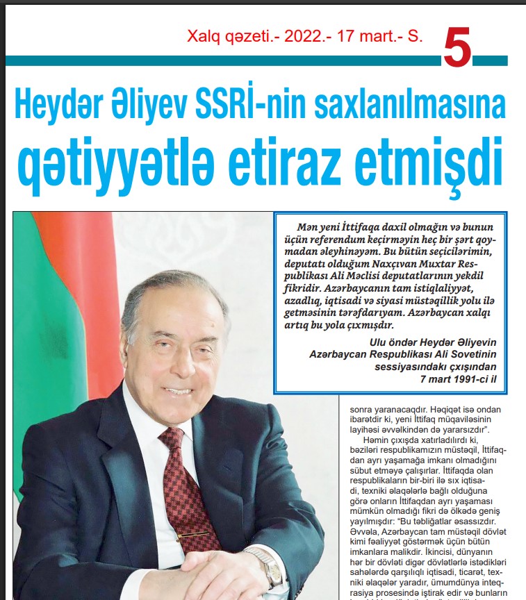 Həmin iclasda (7 mart 1991-ci il) SSRİ-nin saxlanılmasına ən sərt mövqe bildirən deputat Ulu Öndər Heydər Əliyev olub. Heydər Əliyev imperiyanın saxlanilmasina qətiyyətlə etiraz edərək bildirmişdir ki, burada Azərbaycan xalqının gələcək taleyi həll olunur. Mən yeni İttifaqa nail olmağın və bunun üçün referendum keçirməyin heç bir şərt qoymadan əleyhinəyəm. “Bu, bütün seçicilərimin, deputatı olduğum Naxçıvan Muxtar Respublikası Ali Məclisi deputatlarının yekdil fikridir. Azərbaycanın tam istiqlaliyyət, azadlıq, iqtisadi və siyasi müstəqillik yolu ilə getməsinin tərəfdarıyam. Azərbaycan xalqı artıq bu yola çıxmışdır. Azərbaycan xalqının birliyi yeni, demokratik, heç kəsdən asılı olmayan dövlət qurulması yolu ilə təmin oluna bilər. Azərbaycan xalqı birləşməli, öz müqəddəs doğma torpağını göz bəbəyi kimi qorumalıdır. Azərbaycan Respublikası iqtisadi və siyasi müstəqillik yolu ilə getməli, tam istiqlaliyyət uğrunda mübarizə aparmalıdır”.