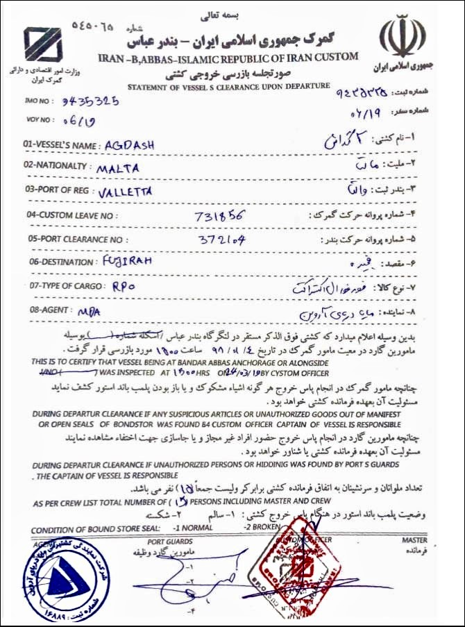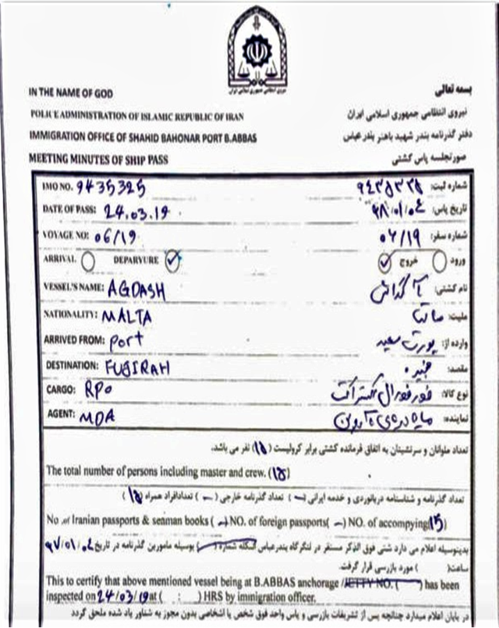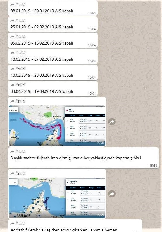 “Deniz Haber”-in əməkdaşı Rəcəb Canpolat bildirir ki, İran körfəzi sahillərindəki Bəndər-Abbas limanındakı rəsmiləşdirmə sənədlərində “Agdash” adlı gəminin mart ayında BƏƏ-nin Fuceyrə limanına getməzdən öncə limanı başqa istiqamətdə tərk etdiyini göstərilir.