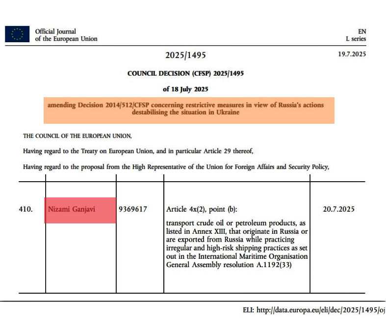 2025-ci il iyulun 18-də Avropa İttifaqının (Aİ) Rusiyaya qarşı qəbul etdiyi 18-ci sanksiyalar paketinin “kölgə donanması” adlanan bölməsində yer alan 105 gəmi-tankerin siyahısında Azərbaycana məxsus “Nizami Gəncəvi” gəmisinin adının hallanması cəmiyyətdə çoxsaylı suallar yaratmışdı. Bununla bağlı dəqiqləşdirmə aparıldıqdan sonra tankerin Azərbaycan Respublikasının dəniz donanmasına aid olmadığı və ölkəmizin bayrağı altında üzmədiyi aşkara çıxdı.