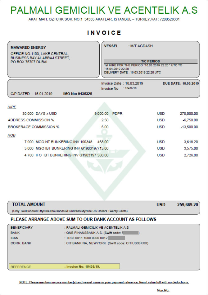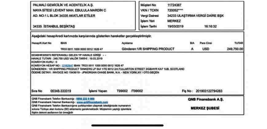 Bununla belə, sənədlər BƏƏ-də yerləşən “Mawared Energy” tərəfindən icarəyə götürülmüş “Agdash”ın “Palmali Shipping”ə taym-çarter kimi hesab-faktura verildiyini göstərir. Bundan başqa, sənədlərdə “Mawared Energy”-nin Amerikanın SWIFT sistemindən istifadə edərək “Agdash” üçün ödənişləri İqor Raspopova məxsus “R Shipping” broker şirkəti vasitəsilə “Palmali Shipping”-in “QNB Finansbank”-dakı hesablarına köçürdüyü görünür.