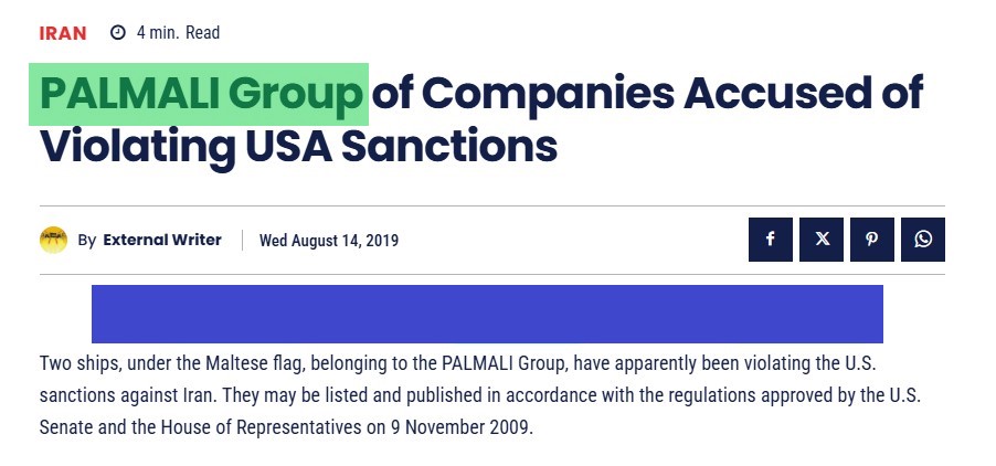 Avstraliyaya məxsus “Newsblaze” saytında “PALMALI Group of Companies Accused of Violating USA Sanctions” (“Palmali Şirkətlər Qrupu ABŞ sanksiyalarını pozmaqda ittiham edilib”) adlı məqalədə qeyd edilir ki, Rusiya bayrağı altında üzən “Ağdaş” və Malta bayrağı altında üzən “Ağsu” gəmiləri "Palmali" Şirkətlər Qrupuna məxsus olub. ABŞ-nin tətbiq etdiyi sanksiyalar pozularaq, İrandan neft daşınıb.