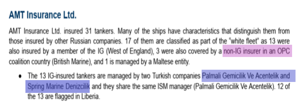 Şirkət bəzi tankerlərini “ağ donanma”nın üzvü kimi beynəlxalq sığorta sistemindən keçirsə də, xeyli gəmisini “İG” olmayan sığortaçılara həvalə edərək dəniz donanmasında ən qaranlıq sxemləri idarə edən Malta qurumları ilə işbirliyinə də üstünlük verib. Əslində “kölgə donanması”na aid bu tankerlər Liberiya bayrağı altında Afrika və digər regionlara Rusiyaya məxsus yanacaq məhsullarını daşıyıb.