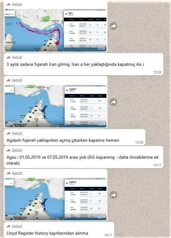 "Onlar yalnız Hörmüzə çatanda avtomatik identifikasiya siqnalının aktiv olduğunu anlayıb və dərhal cihazları söndürüblər. Burada görürük ki, onlar peyk sistemlərini aldatmağa çalışsalar da, sonda özlərini ifşa ediblər", - deyə Canpolat bildirib. O, əlavə edib ki, qeyd edilən ticarət İran və BƏƏ arasında aparılsa da, şirkət Türkiyədə yerləşir və bunun Türkiyənin imicinə necə təsir edəcəyi düşündürür”.