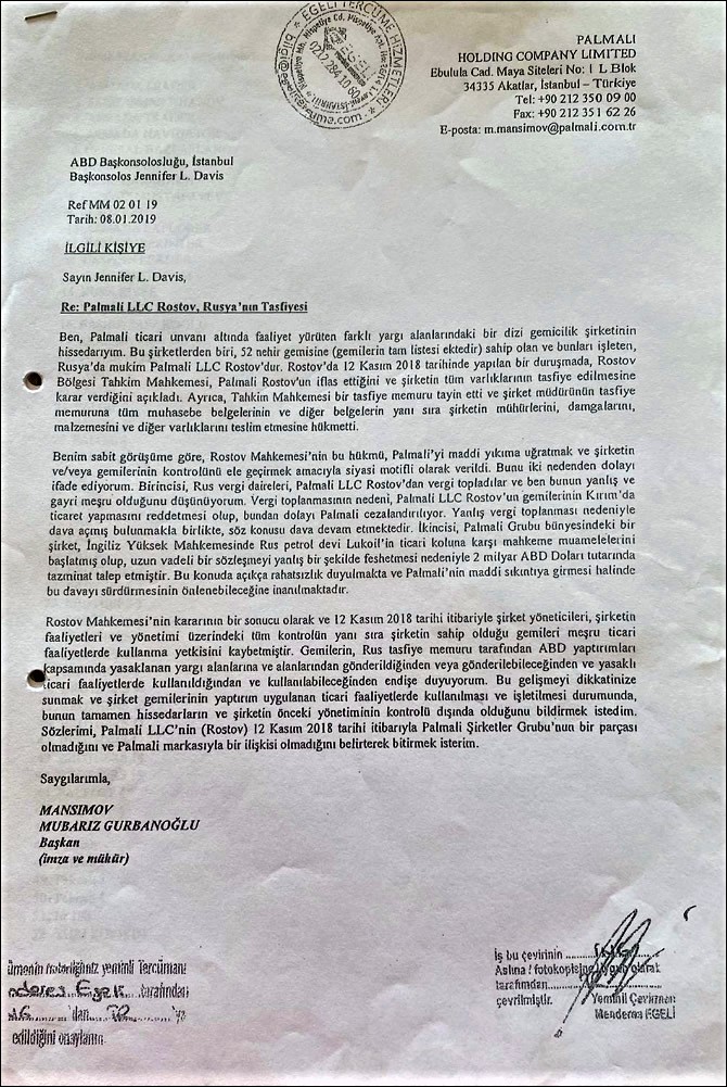 ABŞ-nin İstanbuldakı baş konsulu Cennifer L.Devis “Palmali Rostov” MMC ilə bağlı Mübariz Mənsimova məktub göndərir və İrana qarşı sanksiyaların qüvvədə olduğu müddətdə onun rəhbərlik etdiyi şirkətin qara işlərdə iştirakına dair müfəssəl məlumat istəyir. Mübariz Mənsimov isə konsula cavab məktubu yazaraq rəhbərlik etdiyi “Palmali Rostov” MMC-nin Rusiya Arbitraj Məhkəməsinin 8 yanvar 2019-cu il tarixli qərarı ilə müflis elan edildiyini, “Palmali Rostov” MMC-nin, onun sahibi olduğu və idarə etdiyi gəmilərin İstanbulda yerləşən “Palmali Holdinq”in nəzarəti altında olmadığını, Rusiya Federasiyası Arbitraj Məhkəməsinin şirkətin etibarnamə üzrə müfəttişi təyin edildiyini bildirir.