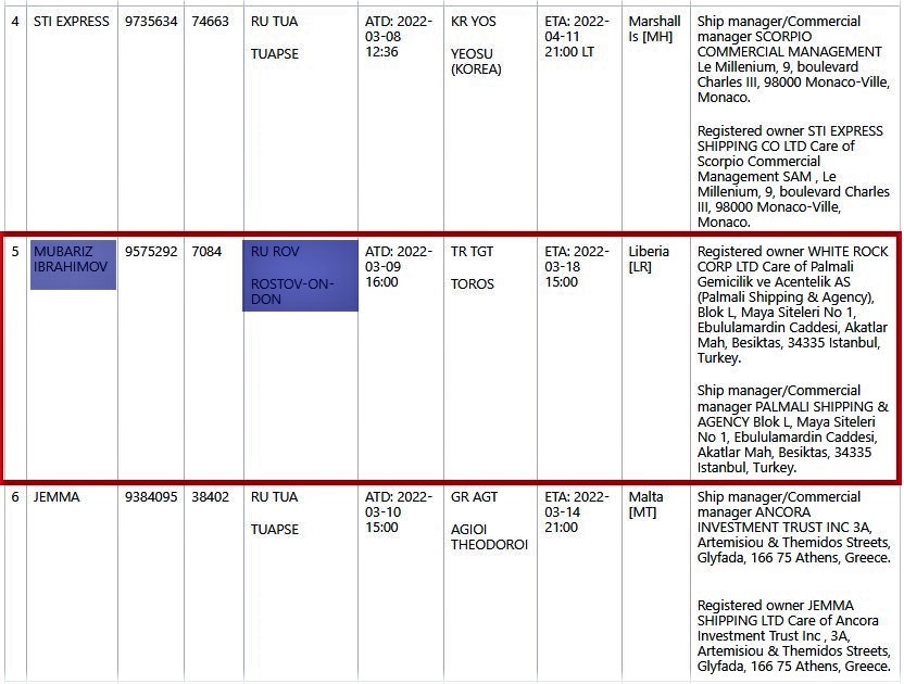 2. “Mübariz İbrahimov” tankeri “Palmali Shipping & Agency”-nin “WHITE ROCK CORP LTD” törəmə şirkəti tərəfindən idarə olunur (ünvan: Blok L, Maya Siteleri No 1, Ebululamardin Caddesi, Akatlar Mah, Besiktas, 34335 Istanbul, Turkey) və Rostov-Dondan Türkiyənin Toros limanına qaçaqmal yolu ilə xam neft daşıdığı sənədlərdə əks olunub.