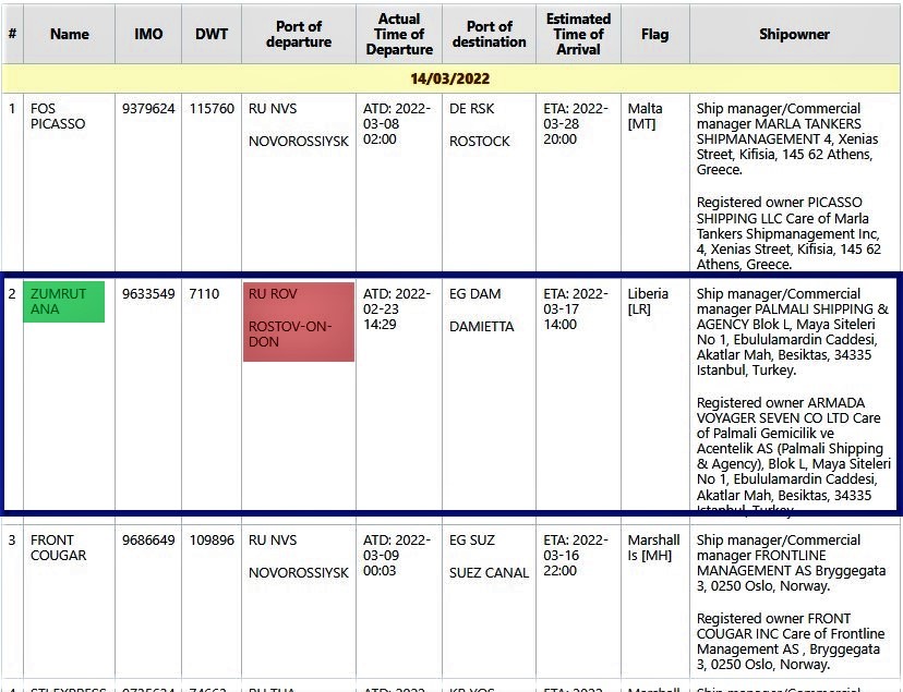 1. “ZUMRUT ANA” tankeri (IMO 9633549) “Palmali Shipping & Agency” tərəfindən idarə olunan “Armada Voyager Seven Co Ltd”-nin adına qeydiyyatdan keçib. Bu tankerin səyahət qeydləri onun Rostov-Dondan Bolqarıstan və digər bölgələrdəki limanlar da daxil olmaqla istiqamətlərə yola düşdüyünü göstərir.