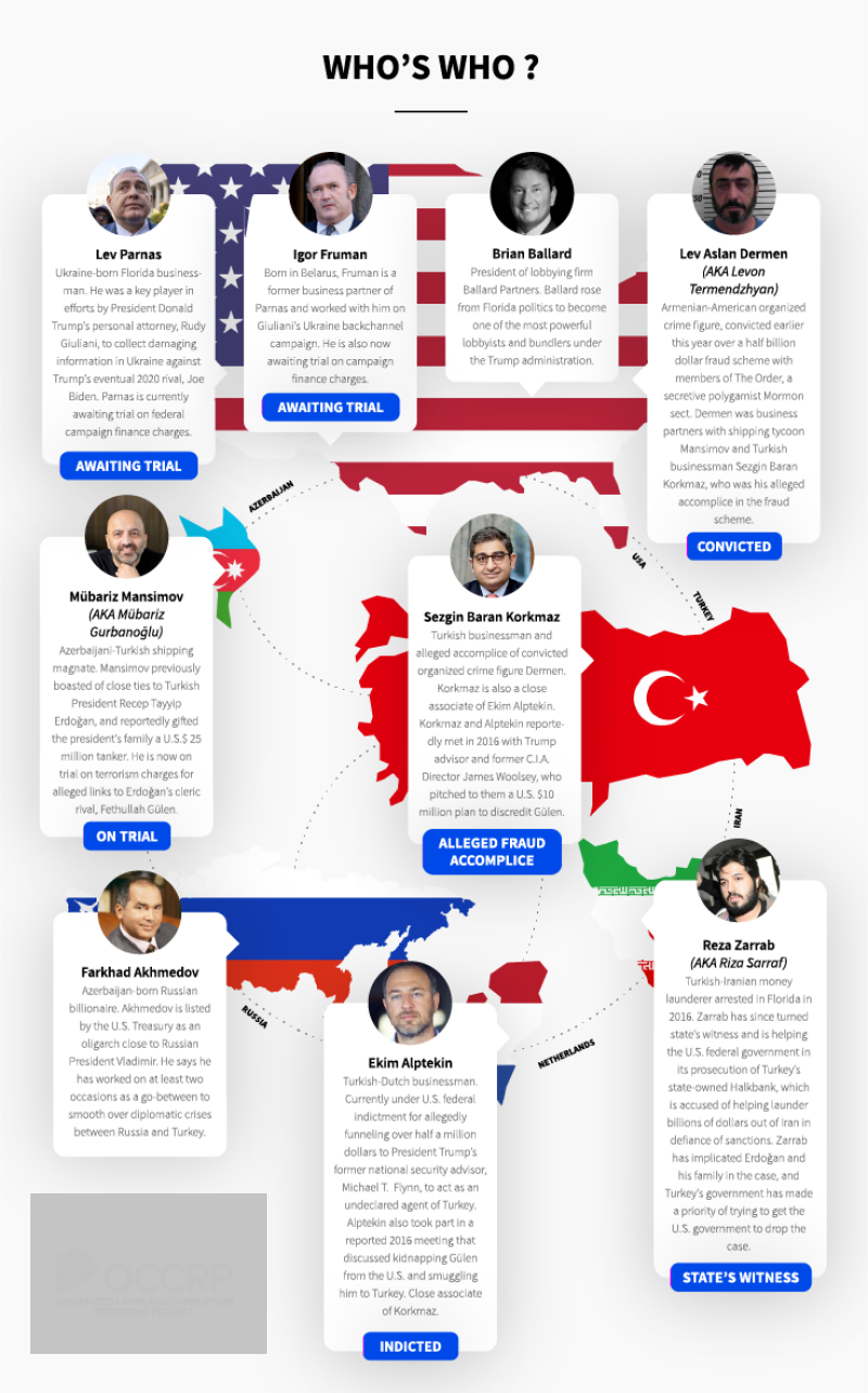 “Courthouse News Service” və “NBC News” tərəfindən aparılan araşdırmada Türkiyənin qanuni maraqlarının ABŞ-də təmsil olunması üçün müqavilə imzalanması, bu müqavilənin reallaşmasında iştirak edən əlaqələndirici şəxslərin Rusiyaya bağlılığı, habelə böyük miqyaslı maliyyə fırıldağı sxemini quran şəxslər və Trampın ilk prezidentlik dövrünün sonlarında impiçmentinə vəsilə olan “Ukraynadakı kompromat qalmaqalının” əsas oyunçuları haqda məlumat verilib.