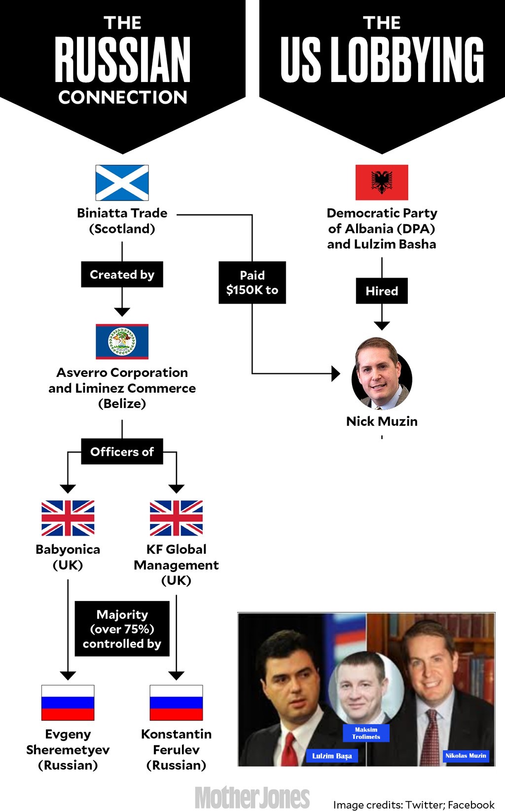 “BBC”-nin araşdırmalarına görə, Nikolas Muzinin adı Albaniyada müxalifətin maliyyələşməsi işində hallanıb. Belə ki, 2023–cü ilin noyabrında Albaniyanın keçmiş Avropa və Xarici İşlər naziri olmuş Lulzim Başa gizli şəkildə Rusiyadan, hətta Vladimir Putin və Yevgeni Priqojinin təsir dairəsində olan şirkətlərdən pul alıb. Araşdırmada qeyd olunur ki, təkcə 500 min dollar Edinburqda yerləşən və Respublikaçı ictimai fəal Nik Muzini Başanın lobbiçisi kimi işə götürən “Biniatta Trade LP” şirkətinin vasitəçiliyi ilə ödənilib.