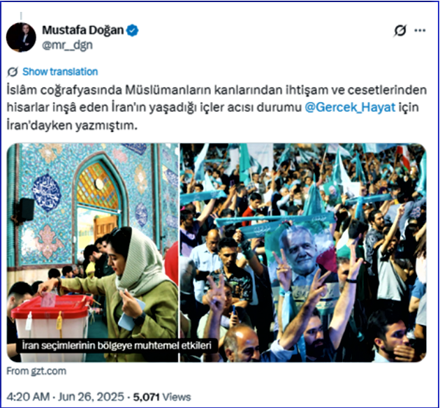 Bu şəxsi araşdırarkən diqqətimizi maraqlı bir məqam çəkdi. M.Doğan 12 aprel 2025-ci il tarixində yazdığı bir statusda İranın "Səhər" telekanalının çəkdiyi bir sənədli filmdən bəhs edir.