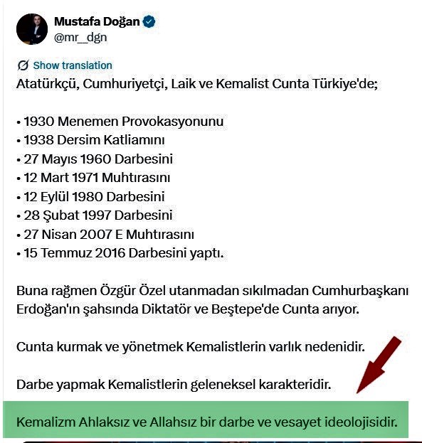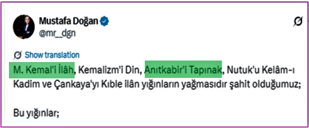 Türkiyə dövlətinə və onun qurucusu Mustafa Kamal Atatürkə qarşı üsyanlar təşkil etmiş Şeyx Səidi "alim və mücahid" adlandıran, Atatürkün Tuncəli şəhərində ermənilərə və kürdlərə qarşı guya “soyqırımı” törətməsi ilə bağlı saxta fikirləri müdafiə edən Mustafa Doğan “Nurçuluq” təriqətinin əsasını qoyan Səid Nursi haqda ancaq tərif yağdırır, ondan "ustad" deyə bəhs edir, ancaq Ankarada Mustafa Kamal Atatürkün mavzoleyini ziyarət edənləri onu "İlahi" elan etməkdə günahlandırır.