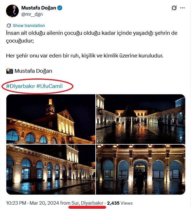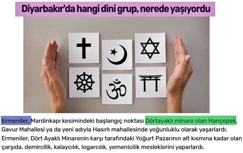 Onun paylaşdığı statusları incələyəndə müəyyən etdik ki, bu şəxs üçün Diyarbəkir yalnız “Ulu camii” məscidi və onun yerləşdiyi “Suriçi” (ermənilər buranı “Xançəpək” adlandırıblar-red.) bölgəsindən ibarətdir. Bu da hər halda səbəbsiz deyil. Mənbələrdə də təsdiqlənir ki, bu məhəllədə yaşayanlar əsasən erməni əsillilər olublar. Diyarbəkir “Ulu camii”sin isə əvvəllər Martomar kilsəsi kimi fəaliyyət göstərdiyi tarixdən məlumdur. Qeyd olunmalıdır ki, “Ulu Camii”nin, əvvəllər assur olması ilə də bağlı müxtəlif iddialar mövcuddur.