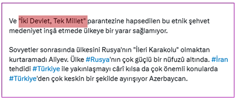 Hətta milli və etnik mənsubiyyəti bir kənara qoysaq belə, bu cümlənin özü Azərbaycanla qardaş və müttəfiq olan Türkiyədə iqtidaryönlü media qrupuna aid bir media qurumunda çalışan şəxs tərəfindən dilə gətirilir. Bu cümləni həm də ona görə xatırladırıq ki, ötən il “Fələstin məsələsi”ni əlində bayraq edib Azərbaycana hücum edən anti-Azərbaycan qüvvələri də aksiyalara belə bir şüarla çıxırdılar: "İki dövlət, tək xəyanət"