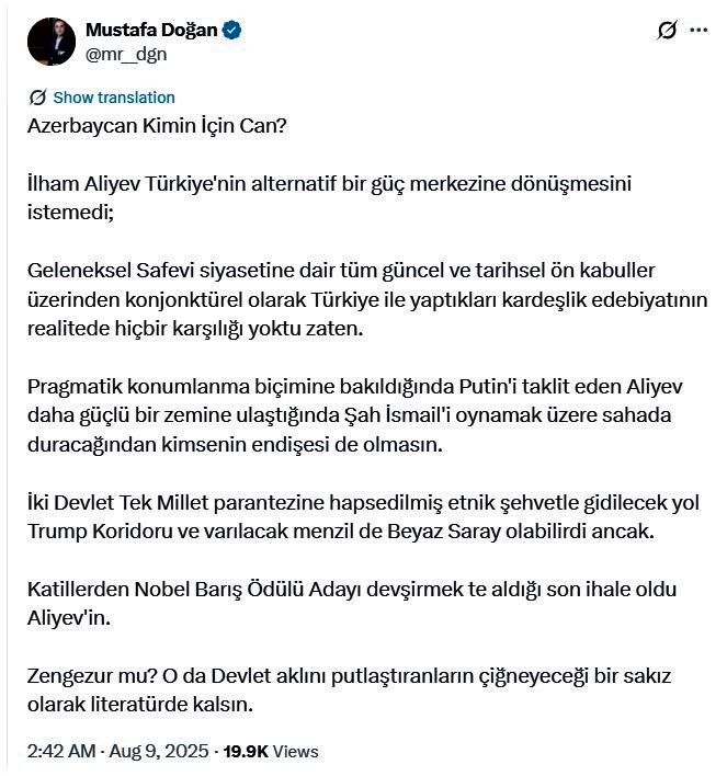 Uzun müddətdir sosial mediada Azərbaycan əleyhinə davamlı neqativ statuslar paylaşan Mustafa Doğanın son məqaləsi Azərbaycan ictimaiyyətində ciddi narazılıq doğurub.