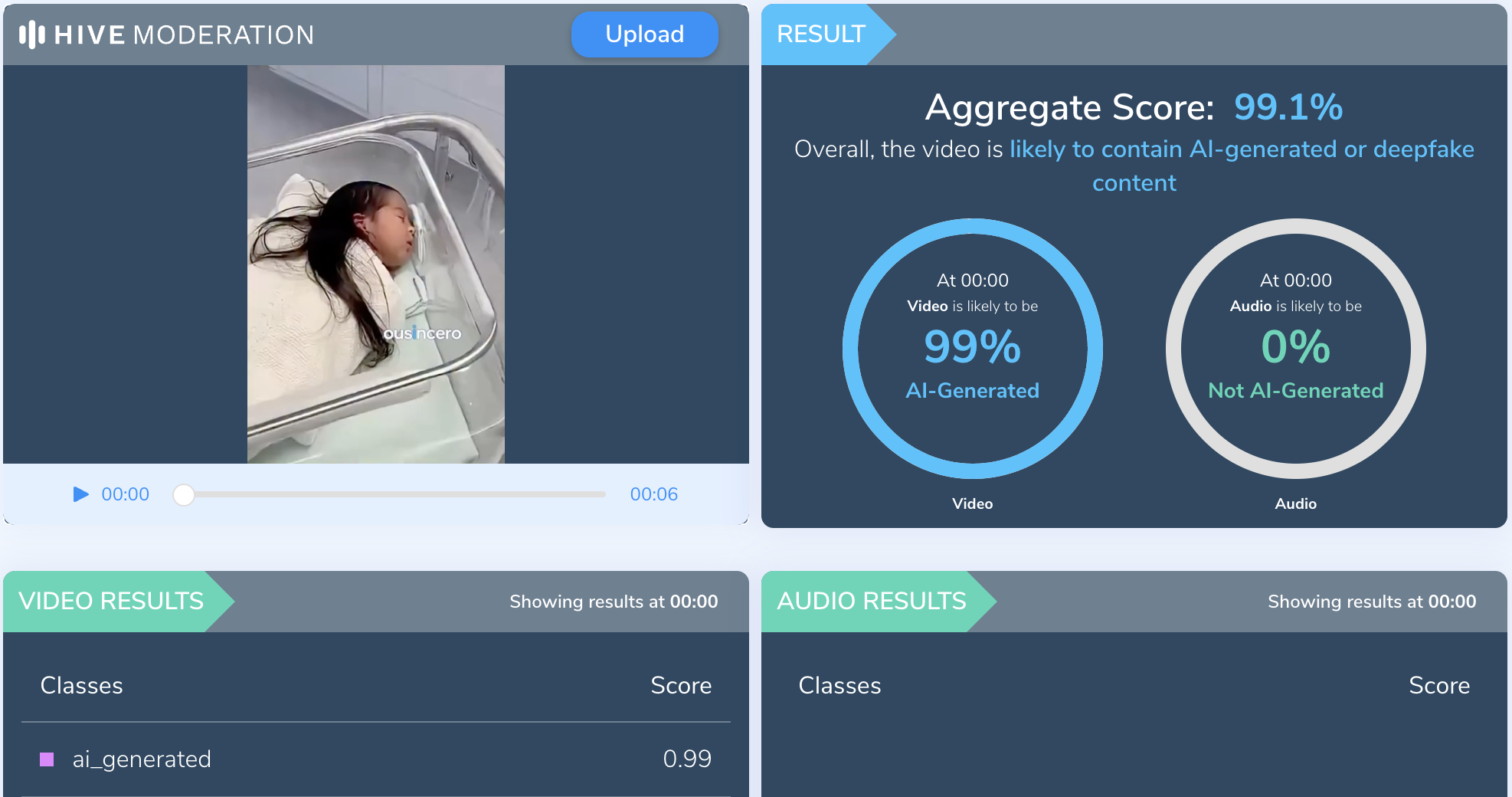 Tərəfimizdən "thehive.ai", "AI or not", "sight engine" Süni İntellekt müəyyənləşdirmə alətləri ilə aparılan analizdə braziliyalı və qazax faktyoxlayıcıların haqlı olduğu təsdiqləndi: video Süni İntellektlə hazırlanıb. Belə ki, "The Hive AI" bu videonun 99%, "Sight engine" saytı 84% süni intellektlə hazırlandığını doğrulayıb.