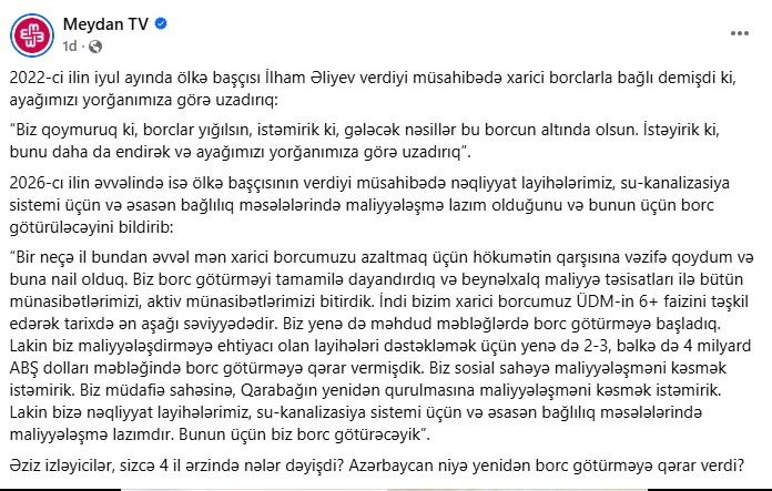 “Meydan TV” Azərbaycanın yenidən borclanmaya hazırlaşdığını və xarici borcun artacağını, gələcək nəsillər üçün borc yükünün yaranacağına dair paylaşım edib. Qeyd edilir ki, 2022-ci ilin iyul ayında Prezident İlham Əliyev xarici borc barədə danışarkən borcun artmasını məqsədəmüvafiq hesab etmədiyini vurğulayıb: “Biz qoymuruq ki, borclar yığılsın, istəmirik ki, gələcək nəsillər bu borcun altında olsun. İstəyirik ki, bunu daha da endirək və ayağımızı yorğanımıza görə uzadırıq”.
