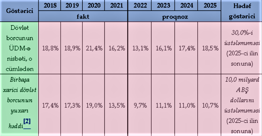 - Borcun ÜDM-də payının 10 faizi ötməməsi dayanıqlı xətt və prinsipial qərar kimi ortamüddətli dövrdə qorunub saxlanılacaq;