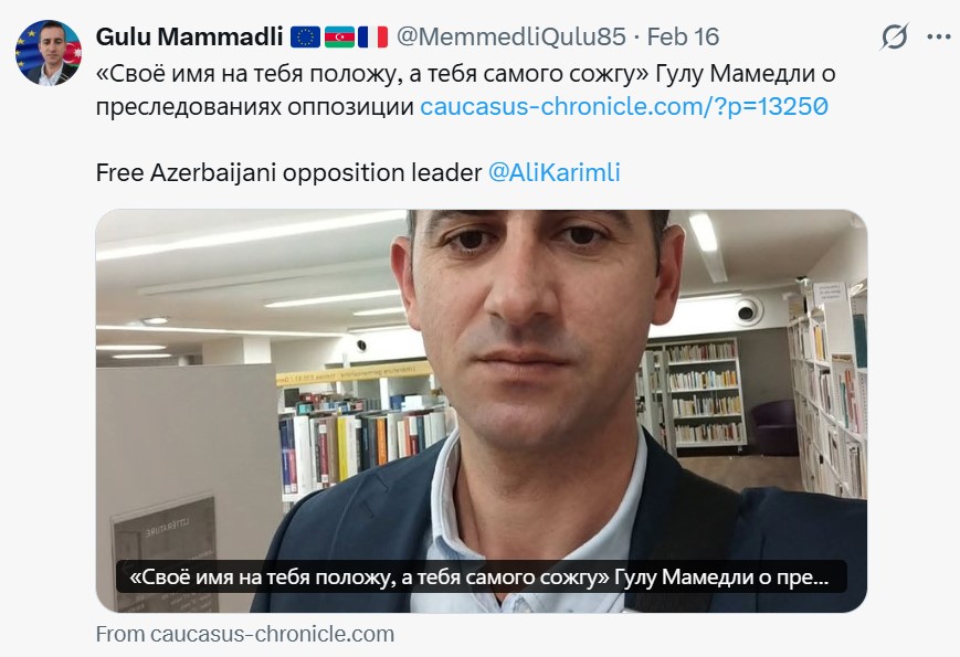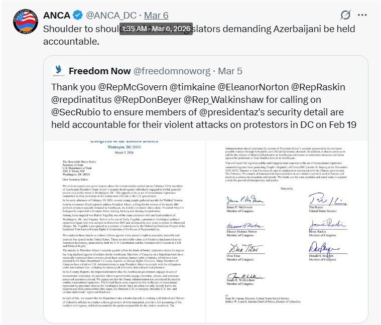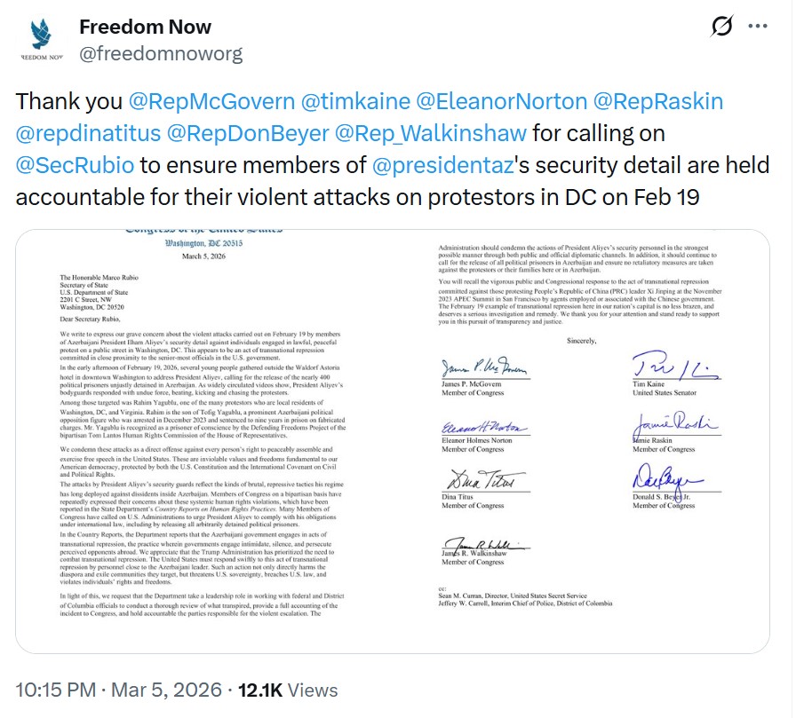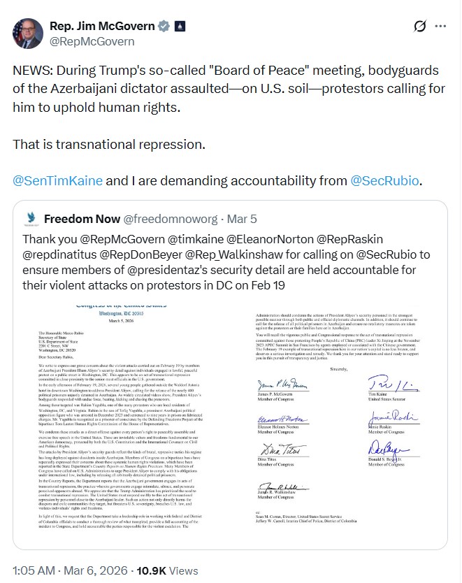“Azadlıq qəzeti” “Facebook” səhifəsi ABŞ Konqresinin üzvü Ceyms Makqovernin (James McGovern) Vaşinqtonda Azərbaycan nümayəndə heyətinə qarşı təxribatda iştirak edən bir qrup şəxslə bağlı “X” platformasında paylaşdığı tvitini yayıb. Qeyd edilən səhifə elə həmin paylaşımda ABS Konqresinin 7 üzvunün vəzifə borclarını yerinə yetirən şəxslər haqda (səhifə bunu “dinc etirazçılara qarşı hədsiz zorakılıq” kimi qələmə verir) əsassız fikirlərini və ABŞ Dövlət katibi Rubiodan “sərt” tədbirlər görulməsini tələb etdikləri müraciəti də yayıb.