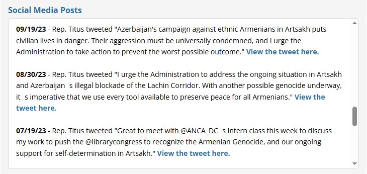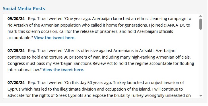 Dina Titus tək Konqresdəki ermənipərəst fəaliyyəti ilə deyil, sosial mediada anti-Azərbaycan kampaniyasında aktivliyi ilə də diqqət çəkib.