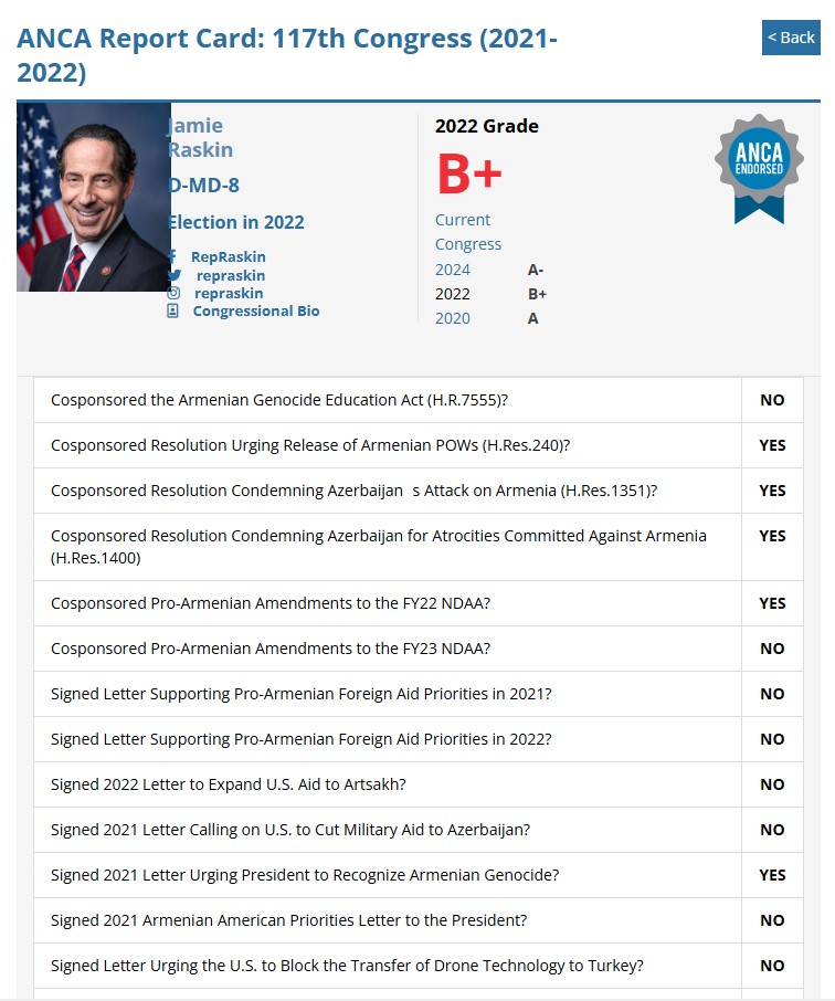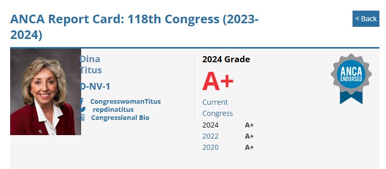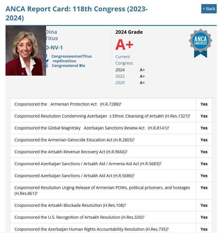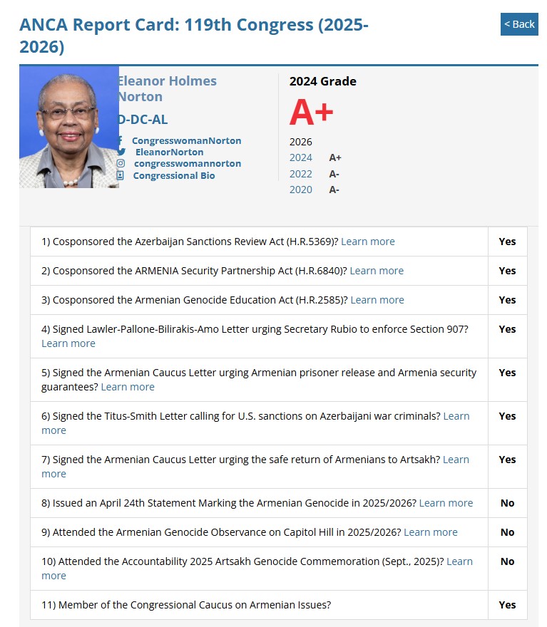 Eleanor Holmes Norton da ANCA ilə əməkdaşlıq edən konqresmenlərdəndir və 2022-2024-cü illərdə ANCA tərəfindən “ən yüksək” (“A+”) qiymətini alıb. Onun bu qiymətləri hansı səbəbdən aldığını öyrənmək üçün təqdim etdiyimiz ekran görüntüsünə baxmaq kifayətdir.