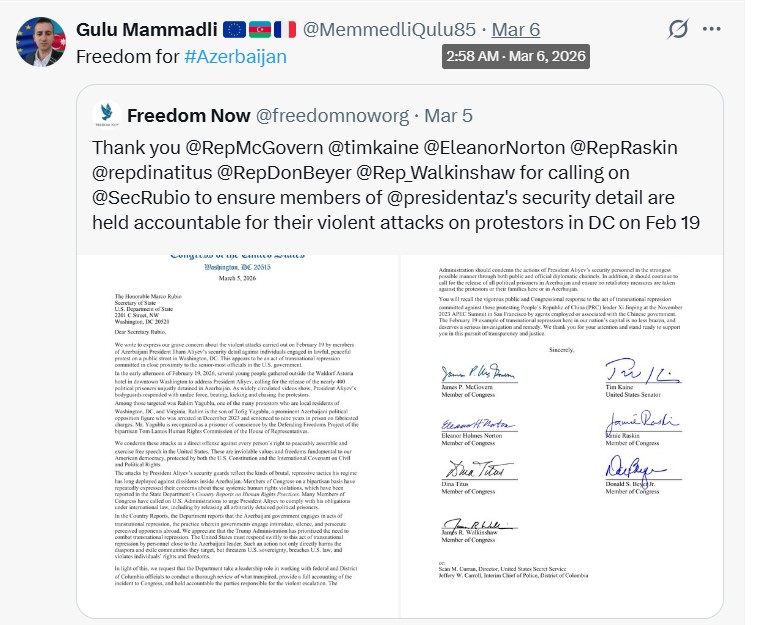 - “Freedom Now” məktubu 6 mart 2026-cı ildə “X”-də yayımlayıb;
