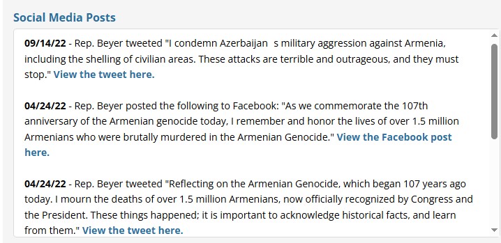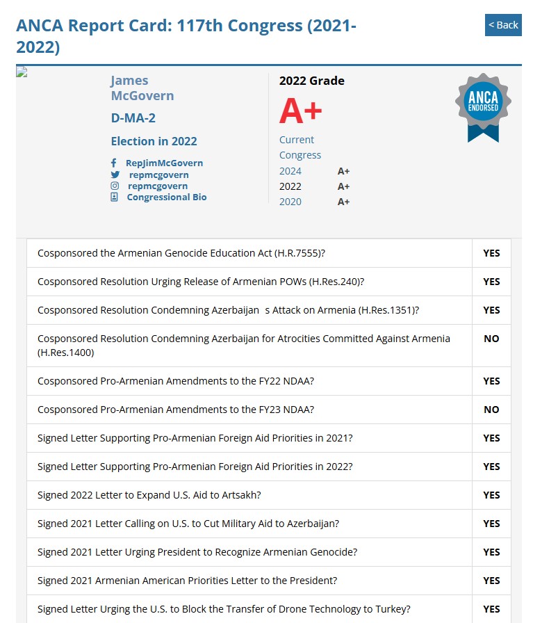 Təşkilatın saytında ermənipərəst konqresmenlərin fəaliyyətini qiymətləndirən sorğu şablonunda 95% suallara “müsbət” cavab verən azsaylı konqresmenlərdəndir.