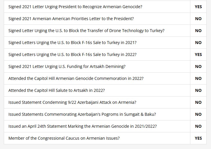 O, bu qiymətləri qondarma “erməni soyqırımı” Təhsili Qanununa (HR7555) həmmüəlliflik etdiyi, erməni əsirlərinin azad edilməsinə çağıran birgə qətnaməni (H.Res.240), Azərbaycanın Ermənistana “hücumunu” pisləyən qətnaməni (H.Res.1351), 2021-ci ildə ermənistanpərəst xarici yardım prioritetlərini dəstəkləyən məktubu, ABŞ-nin terrorçu rejimə yardımını genişləndirmək üçün erməni Bürosunun 2022-ci il məktubunu, ABŞ-ni Azərbaycana hərbi yardımı dayandırmağa çağıran 2021-ci il məktubunu, 2021-ci ildə prezidentə Erməni Soyqırımını tanımağa çağıran məktubu, ABŞ-ni Türkiyəyə dron texnologiyasının ötürülməsinin qarşısını almağa çağıran məktubu, ABŞ-ni 2021 və 2022-ci illərdə Türkiyəyə “F-16” satışını dayandırmağa çağıran məktubu və s. sənədləri imzaladığı üçün alıb.
