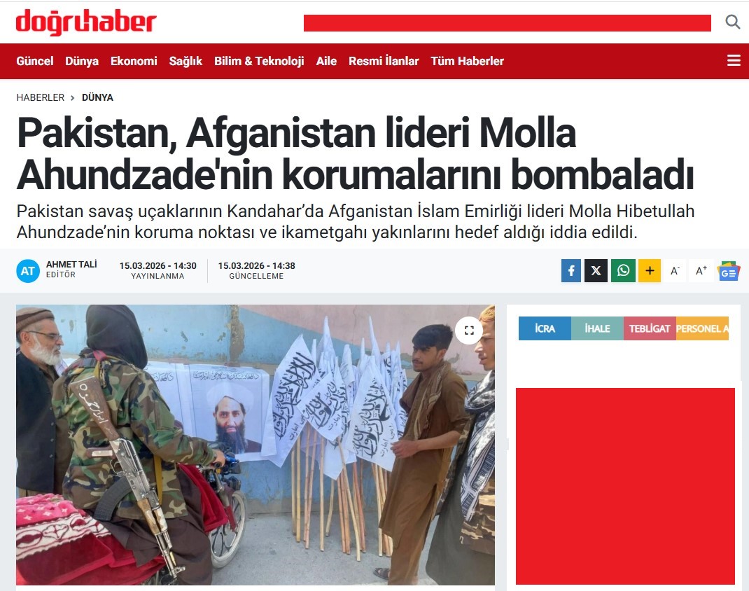 Araşdırma zamanı Türkiyə mediasında mövzunun İrana yaxınlığı ilə bilinən "doğruhaber" portalında daha çox işıqlandırıldığını müəyyənləşdirdik. Saytda "Pakistan Əfqanıstan lideri Molla Axundzadənin mühafizəçilərini bombaladı" başlıqlı xəbər yayımlanıb. Xəbərdə Əfqanıstan İslam Əmirliyi hökumətindəki yüksək vəzifəlisili və Heybətullah Axundzadənin yaxın adamlarından birinin Pakistan hərbi təyyarələrinin hərəkat liderinin mühafizə məntəqəsini hədəf aldığını və gecə ərzində onun iqamətgahının yaxınlığında hava hücumları həyata keçirdiyini təsdiqləməsi qeyd olunub. Mənbə bildirib ki, Axundzadə hücum zamanı ərazidə olmayıb, o və ətrafındakılar zərər çəkməyib.