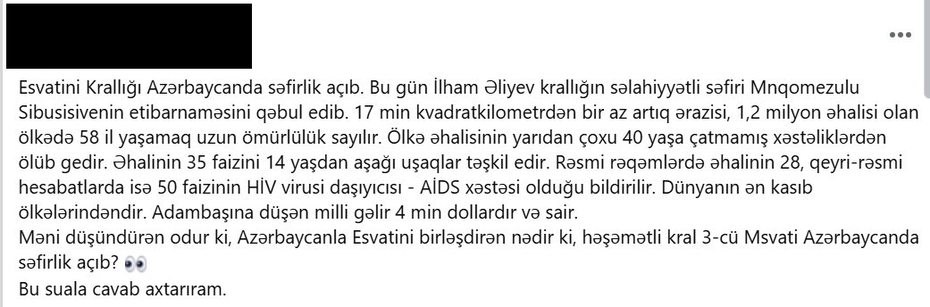 Müxalifətçilərin "Esvatini Krallığı Azərbaycanda səfirlik açıb" cümləsi texniki baxımdan yanlışdır. Səfirlik açmaq — bina kirayələmək, bayraq asmaq və orada daimi diplomatik heyət yerləşdirmək deməkdir. Esvatini isə sadəcə səfir təyin edib.