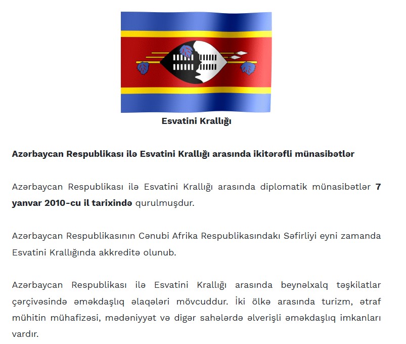Əvvəla qeyd edək ki, Esvatini Azərbaycanda rezident səfirlik (daimi bina və işçi heyəti olan ofis) açmayıb.