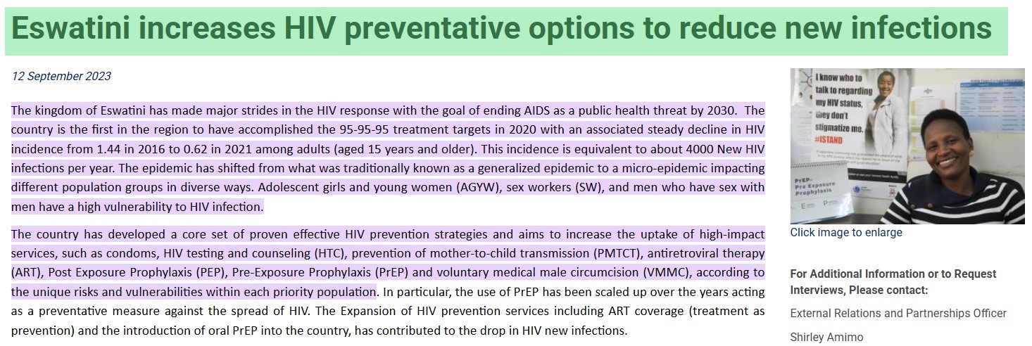 Cəbhəçilərin bu ölkədə əhalinin 50%-nin HİV daşıyıcısı olması barədə iddiası da heç bir tibbi fakta söykənmir. Əksinə, Esvatini son illərdə bu istiqamətdə kəskin irəliləyiş əldə edən nadir ölkələrdəndir: