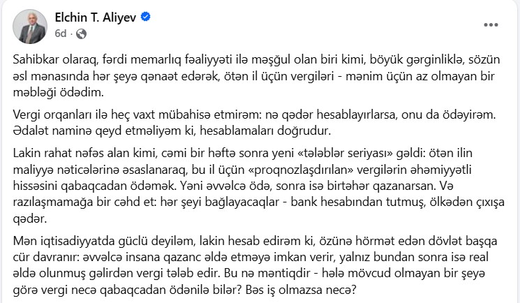 Sosial media hesablarında yazdığı qalmaqallı statusları ilə tanınan memar Elçin Əliyev vergi orqanı tərəfindən ona fərdi sahibkar kimi "əvvəlcədən vergi ödəmə" tələbi qoyulduğunu iddia edib. Memar indiyə qədər belə bir halla rastlaşmadığını, ötən ilin vergilərini tam ödədiyini və vergi orqanı ilə heç vaxt mübahisə yaşamadığını bildirib: