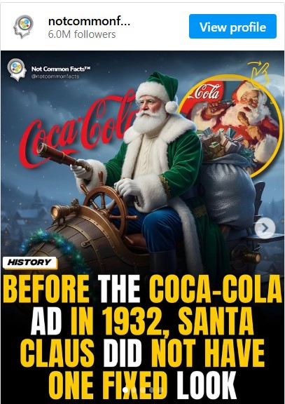 Over the years, people on social media have credited the modern image of Santa Claus to Coca-Cola. Some have said (archived) that Santa did not have one fixed look (archived) before a 1932 Coca-Cola advertisement, whereas others have gone so far as to claim Santa never wore red (archived) until the soft drink company rebranded him. The rumors rely heavily on the fact that Santa's red-and-white suit matches the colors central to Coca-Cola's branding.
