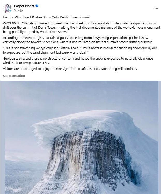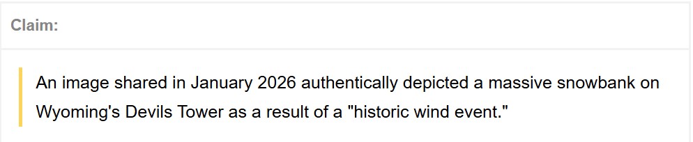 In January 2026, a rumor circulated online claiming that an image authentically showed a massive snowbank on Wyoming's Devils Tower National Monument — known as "Matȟó Thípila" to the Lakota — as a result of a "historic wind event."