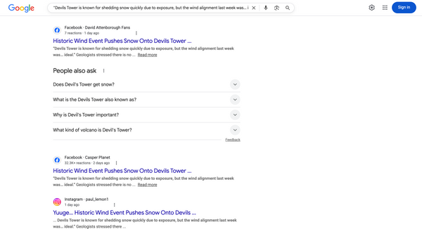 Some readers seemed to interpret the rumor as a factual recounting of real-life events. However, there was no evidence a massive wind storm created a snow shelf of the size shown in the image on Devils Tower. A Google search of one of the reported quotes by an "official" turned up results only related to the social media post. If a U.S. National Park Service official had actually shared the quote with any credible media outlet, Google search results would reflect that:
