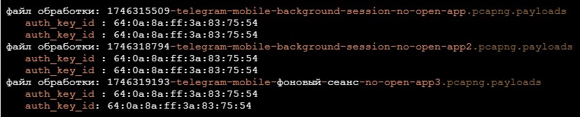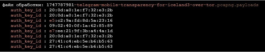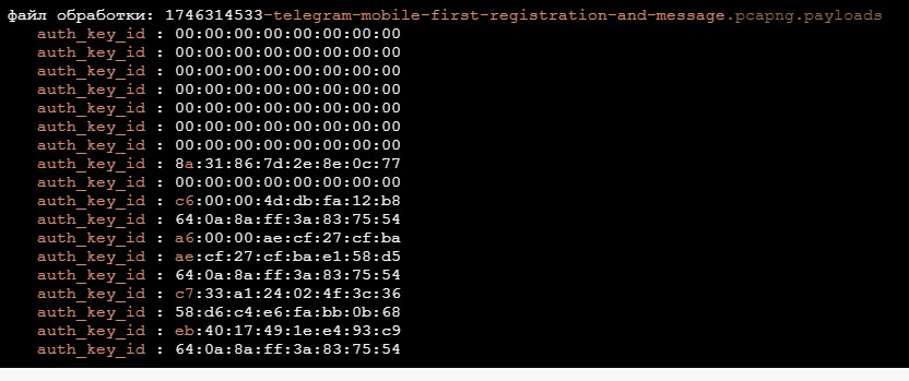Большинство наблюдавшихся мной пакетов оказались обфусцированы с использованием схемы обфускации MTProto 2. Как уже упоминалось, я написал инструмент для их деобфускации и попытки извлечьauth_key_id. Ниже приведен вывод этого инструмента.