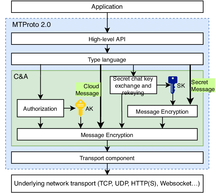 Согласно собственной документации Telegram, все клиент-серверное общение в системе происходит с использованием MTProto 2. Сообщения, которые не зашифрованы сквозным способом — сообщения группового чата, обновления каналов или просто так называемые «облачные чаты» по умолчанию — шифруются MTProto 2 с использованием ключа, используемого для клиент-серверного взаимодействия (в документации он называется «ключ авторизации»).