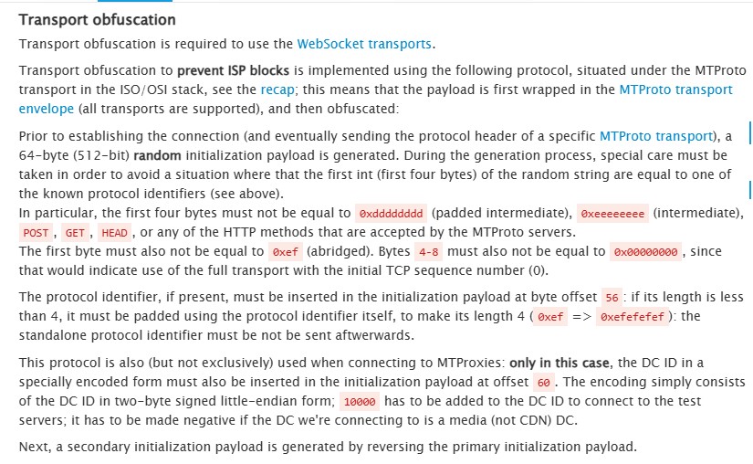 Кроме того, MTProto 2 довольно очевиден в перехватов пакетов, отчасти из-за последовательностей байтов, которые идентифицируют, какой конкретный формат используется в каждом конкретном случае (протокол поддерживает большой выбор транспортов). Вероятно, поэтому пришлось добавить слой обфускации, чтобы можно было помешать относительно тривиальной фильтрации пакетов.