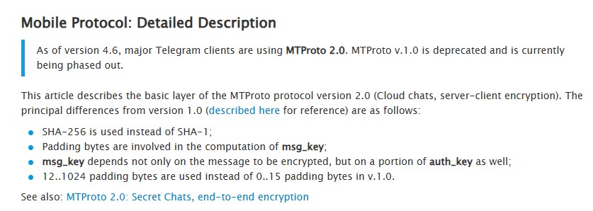 И все же, по непонятной причине, Telegram решил в основном использовать свой собственный MTProto 2 для клиент-серверного транспорта вместо использования проверенного TLS. Хотя технически HTTPS является одним из возможных транспортов MTProto 2, но я не нашел никаких указаний на использование HTTPS в качестве транспортного уровня ни в одном из проанализированных мной перехватов пакетов.