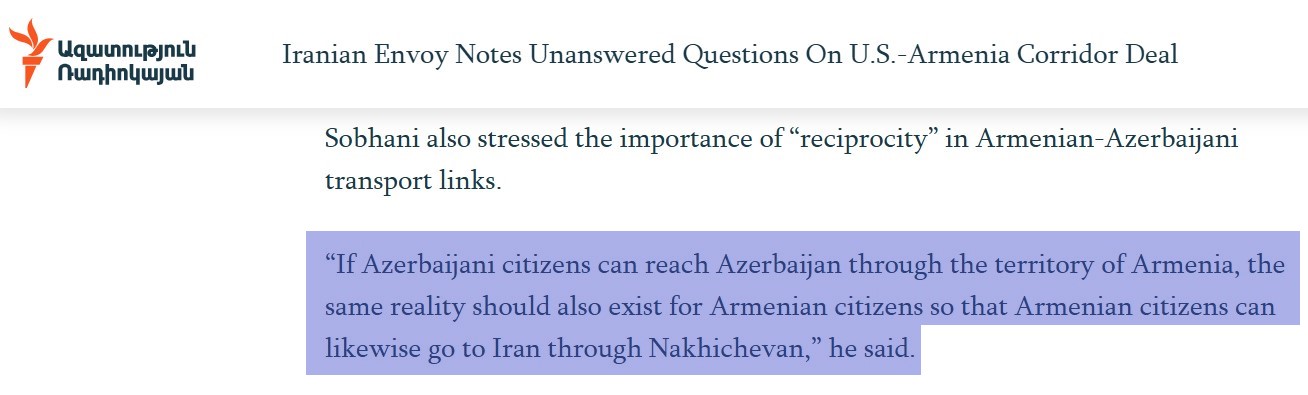 Мехди Собхани заявил, что для этого необходимо проложить дорогу по маршруту Армения – Нахичевань – Иран. Цитата: «Армения должна быть связана с Ираном через Джульфу». shahraranews.ir