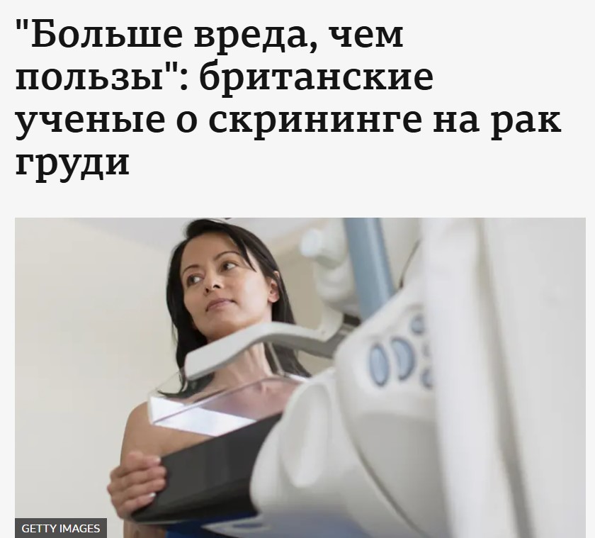 Наконец, результаты анализа, которые в 2021 году опубликовало Национальное бюро экономических исследований США, показали: на каждые 100 000 женщин, регулярно проходящих маммографию, добавленная смертность от всех причин составляла семь человек. Иными словами, в этой группе женщины умирали чаще, чем в среднем по популяции. Точных причин эксперты не указали, однако можно предположить, что среди них было ненужное тяжёлое лечение от онкологических заболеваний, к которому привела гипердиагностика.
