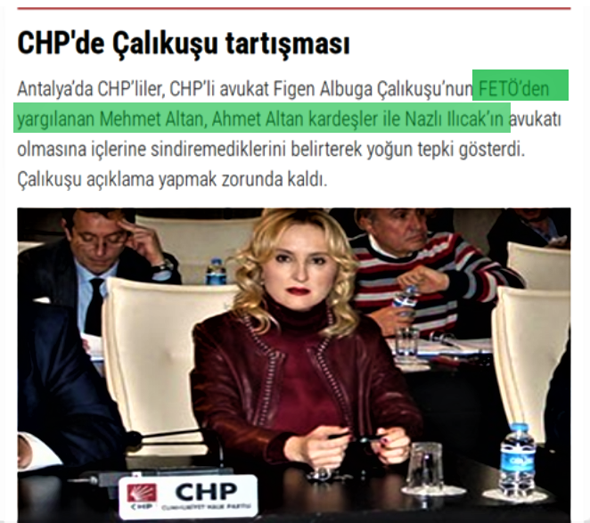 Ahmet Davutoğlu'na yakınlığı ile bilinen Karar gazetesi yazarı Figen Çalıkuşu FETÖ’cü gazeteciler Mehmet Altan, Ahmet Altan kardeşler ile Nazlı Ilıcak’ın avukatı olarak biliniyor.
