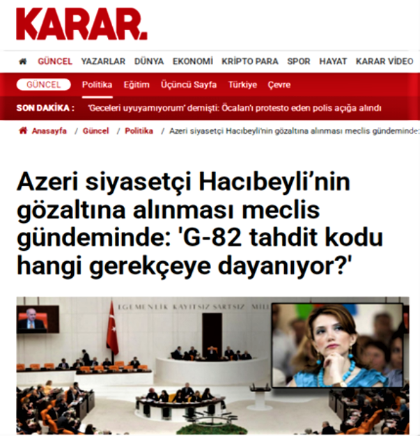 7. Gelelim "Karar Haber" X hesabına... Karar gazetesi Gültekin Hacıbeyli konusunda aktif olan medya kuruluşlarından birisidir... "Azeri siyasetçi Hacıbeyli'nin gözaltına alınması meclis gündeminde: G-82 tahdit kodu hangi gerekçeye dayanıyor?!" yazısı yayınlandı.